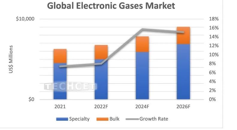 6月21日消息,據商業(yè)和技術資訊電(diàn)子材料谘詢機構《TECHCET》報告顯示,2021 年全球電子特(tè)氣市(shì)場營收達63 億美元,預計2022 年(nián)將再成長8%,到2026 年年(nián)複合成長率高達9%。增長(zhǎng)的主要原因歸功(gōng)於半導體產業對於電子特氣的需求。隨著先進邏輯芯片和新世代存儲芯片需求不斷(duàn)增加,蝕刻、沉積、真空腔室清潔及其他應用的特種氣體需(xū)求將越來越多。
