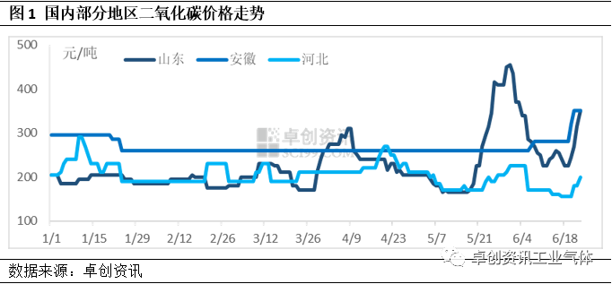 高溫在降低企業生產負荷的同時,也帶動了市場的需求。據卓創(chuàng)資訊了解,近期幹冰需(xū)求(qiú)較月初(chū)有明(míng)顯增加(jiā),有企業表示,近期(qī)受高溫影響(xiǎng),下遊拿貨積(jī)極,幹冰出貨量較月初增幅一倍有餘。受此帶動,二氧化碳生產(chǎn)企業出貨普遍好(hǎo)轉,部分地區企業庫存(cún)液位快速降至低位,廠家出貨無憂,市場氛圍持續向好。而反映到價(jià)格上(shàng),雖然(rán)全國市場(chǎng)均價並未有較大調整,但山東、河北等地價格均出現明顯上漲,截至6月25日,市場均價分別為385元/噸、270元/噸,較上周末分別(bié)上漲71%、74%。安徽市場則在需求增長的基礎上,疊加(jiā)裝置集中檢修影響(xiǎng),市場均價從6月中旬的280元/噸左右上調至(zhì)6月25日(rì)的(de)375元/噸左右,市場價格已處(chù)於上行通道之中。