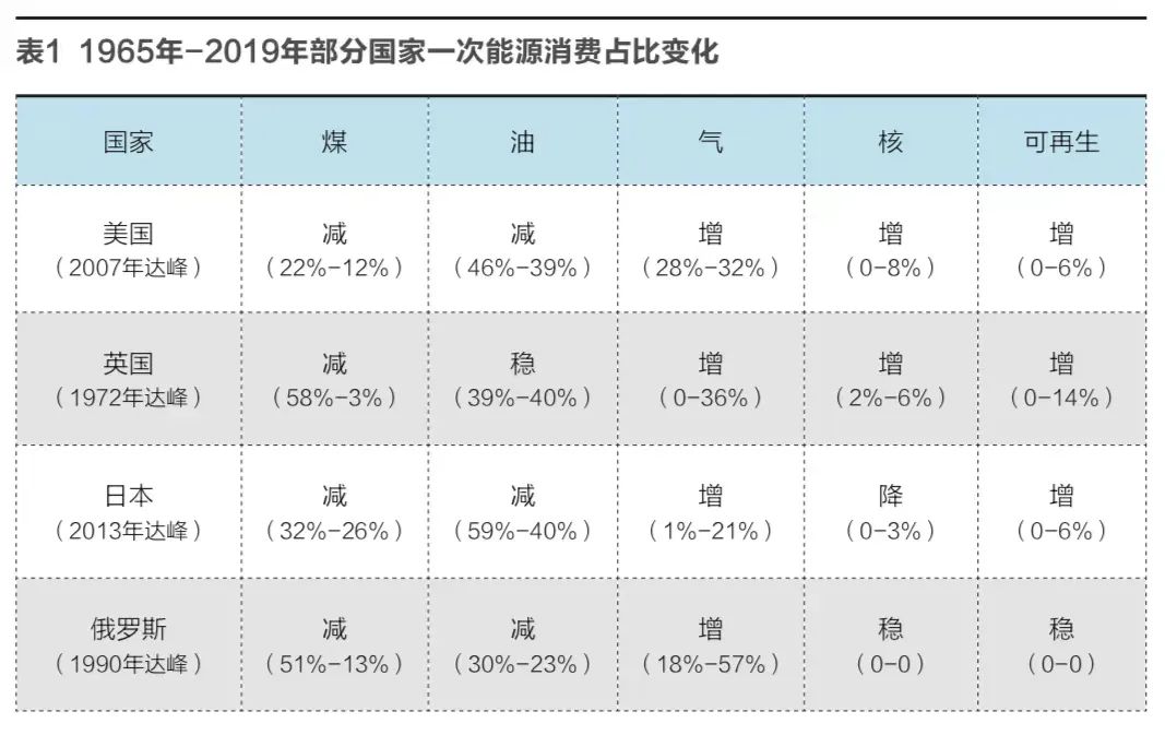 首先,根據筆者的研究發現,由於碳達峰通常伴隨著能源消(xiāo)費峰(fēng)值出現,因此國際社會普遍認為的“雙(shuāng)碳”路徑是:控製能源消費總量+優(yōu)化(huà)結構(gòu)並重。大多數國家也都采取了減煤、穩油、增氣、大力發展可再生能源等措(cuò)施。見表1