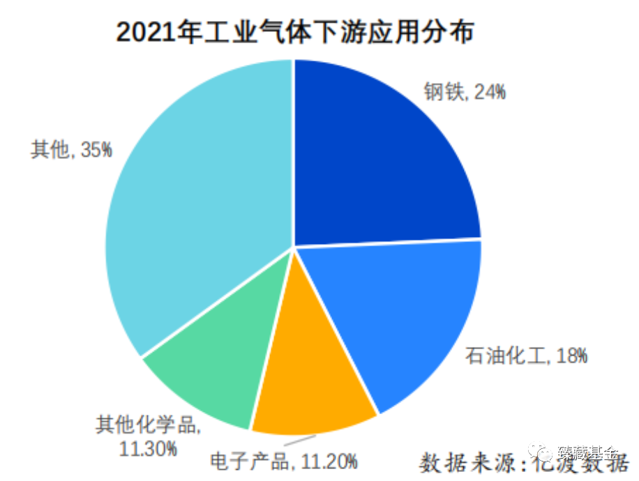 工業氣體行業的下遊應用(yòng)領(lǐng)域廣泛,其中鋼鐵、石油化(huà)工、冶金等傳統行業技術含量較低,對工業氣體需求(qiú)量大,占(zhàn)比約為80%;電(diàn)子(zǐ)產品、環保新能源等(děng)新型行業技術含量高,對工業氣體純度要(yào)求高,占比約為(wéi)20%。
