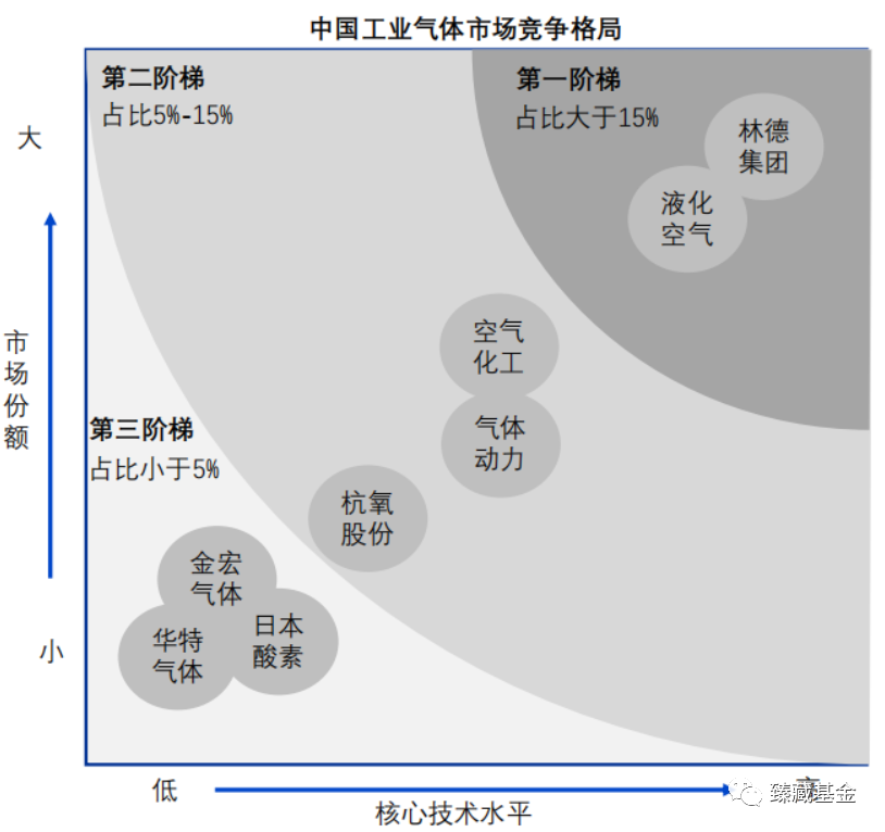 (1)中國工業氣體市場(chǎng)第一(yī)梯隊包括林德集團和液化空氣兩大企業,2021年兩家公司的市場份(fèn)額占比分別為21.9%和20.7%。國際知名工業氣體企業技術雄厚(hòu),規模龐大(dà),具有強大的綜合實力,其競爭優勢和競爭地位在短期(qī)內難以(yǐ)被撼動;