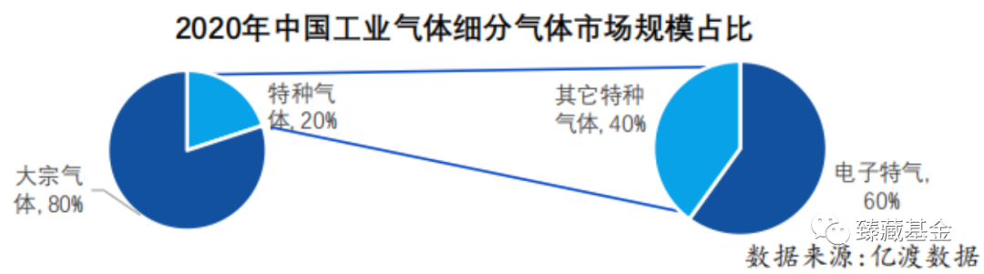 大宗氣體指純度要求低於5N,產品產銷量大的工業氣體;根(gēn)據製備方式的不同可分為空分氣體和合成氣體。2020年工業(yè)氣體市場規模(mó)為1626億元,其中大宗氣體市場規(guī)模占(zhàn)比約(yuē)為80%。特種氣體指被(bèi)應用於特定領域,對純度、品種、性質有特殊要求(qiú)的工(gōng)業氣體;根據應(yīng)用領域的不同可分為標準氣體、醫療氣體、激光氣體、食品氣體、電光(guāng)源(yuán)氣體(tǐ)以及電子(zǐ)氣體。2020年,中國特種(zhǒng)氣體市(shì)場規模約占工業氣(qì)體市場規(guī)模的20%。在特種氣體行業中,電子特氣占據主要市場(chǎng)份額,約為60%。