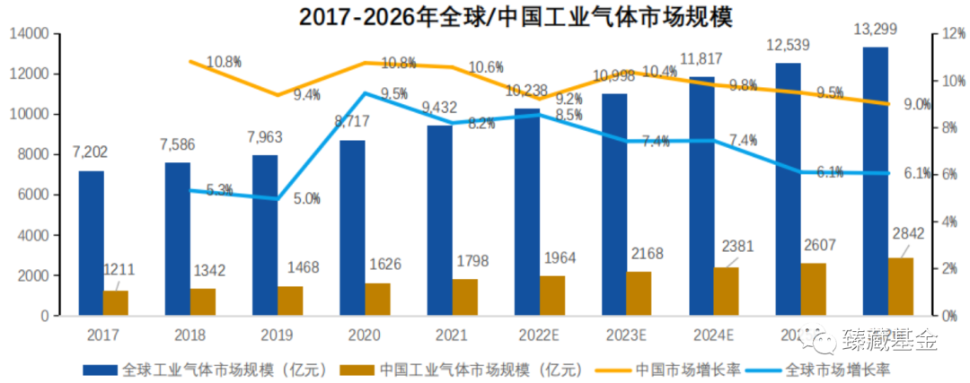 全球工業氣體行業發(fā)展曆經200多年,整體呈穩步發展。2017年全球工業氣體行(háng)業市場規模為7202億元,2021年(nián)增長至9432億元(yuán),複合增長率(lǜ)為6.97%。在全球經濟穩(wěn)步(bù)增長,工業發展穩定的環境下,全球工業氣體市場將持續穩定增長,預計到2026年市場規模(mó)將達到13299億元,2021-2026年複合增長率為7.11%。中國(guó)工業氣體行業較(jiào)全球工業氣體行業起步晚,但在(zài)國家政策推動,外資引入,高(gāo)新技術發展等因素的影響下發展(zhǎn)迅(xùn)速。中國工業氣體行業(yè)的(de)市場規模由2017年的1211億元增長至2021年的1798億元,年複合(hé)增長率為10.39%。未來隨著(zhe)工業快速發展、國家政策推動和以電子特種氣體為代表(biǎo)的新興用氣需求不斷爆發,中國工業氣體市場將繼續(xù)保持增長,預計到2026年中國工(gōng)業氣體(tǐ)行業的市場規模將達(dá)到2842億元,2021-2026年複合增長率為9.59%。