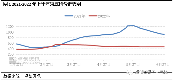 從近兩年液氧價格走勢圖來(lái)看,2021與2022年走勢大不相同。2021年受鋼鐵(tiě)、石化等相關(guān)行業利好(hǎo)帶動,上半年液氧需求增量明顯,支撐(chēng)價格不斷上移,其中5月均(jun1)價創三年來新高。而(ér)從2022年上半(bàn)年液氧市場表現來看,需求(qiú)下滑、運力受限和心態偏空等等利空抑製市場好轉,上半年液(yè)氧走勢為先揚後抑,價格區間在350-550元/噸波動。根據卓創資訊數據監測,2022上半年液氧均價為469元/噸,同比下降39%。