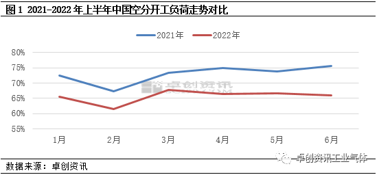 據卓創資訊數(shù)據監(jiān)測,2022年上(shàng)半年中國空分開(kāi)工負(fù)荷率65.64%,較2021年上半年下降7.23個百分點。1月受國內鋼廠高爐開工負荷提升影響,配套空分開工負荷率有所增長,但月下旬,受春節假期需求減弱影響,多地全液化裝置停車,2月開工(gōng)負荷降至年內低位,2月中國(guó)空分開工負荷率降至61.57%,環比1月降3.97個百分點。節後,隨著複工複產推進,空分開工(gōng)負(fù)荷逐漸提升。3月中旬以後,北方采暖季結束,京津冀及周邊鋼廠開工負荷提升,空分開工負荷有明顯增長,3月空分開工(gōng)負荷漲至67.7%,環比2月漲6.13個百分點(diǎn)。4月份以後,受多地管控影響,廠商(shāng)出貨承壓,同時配套鋼鐵、石化企業降負,空分(fèn)開工負荷維(wéi)持在65%左右窄幅變化。