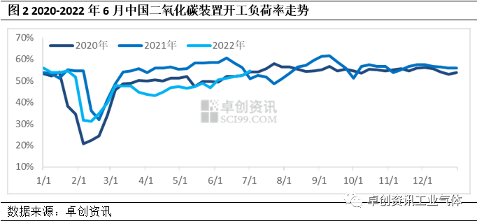 卓創資訊認為,2022年市場開工(gōng)負荷(hé)率偏低的原因主要有以下幾點:一是上(shàng)半年交通運輸長期受到管控,導致廠家出貨受限,庫存液位承壓,導致開工負荷下降。從圖中可以看出,4月份出現二次下探,就是由於國內多數地區交通管控,廠家出貨不佳,液位攀升至高位後,裝置多有減(jiǎn)負荷運行,而隨著運力管控影響減弱,開工負荷率逐步上升;二是部分企業上遊原料氣不足,導致二氧化碳生產受影響,開工負荷率下(xià)降。例如部分以進(jìn)口原油(yóu)為原料的煉廠,受國(guó)際局勢影響,進口量(liàng)減少(shǎo),開工負荷率下降,導致二氧化碳生產企業開工負荷率(lǜ)同步降低;三是進入6月後,受高溫天氣影響,部分生產企業減(jiǎn)負荷運行(háng),導致裝置開工負荷率出現小幅下降。