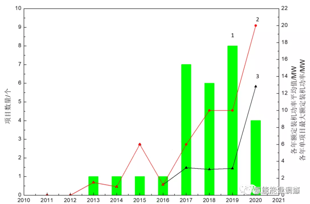 過去10年全球加速推進可再生能源PEM電解水製氫示範項目建設,示範項目數量和單體(tǐ)規模(mó)呈現逐年(nián)擴大的趨勢。目前PEM水電解製氫已邁入10 MW級別示範應用階段,100 MW級別的PEM電解槽正在開發,NEL-Proton、SIEMENS、ITM Power等公司在技術與裝備製造方麵處(chù)於領先(xiān)。