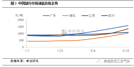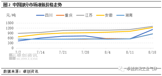 [導語]進入(rù)下半年以來,隨著工(gōng)業氣體下遊(yóu)需求麵逐漸修複及(jí)供應壓力緩解,價格均呈現震蕩小漲態勢。進入8月,隨著長(zhǎng)三角(jiǎo)、川渝、兩湖等多地(dì)高溫(wēn)預警(jǐng),工業企業生產多有降負,空分(fèn)開(kāi)工負荷持續下(xià)降,液氧、液(yè)氮、液氬供應均有不同程度收緊,支撐(chēng)其(qí)價格加速上行。短線(xiàn)來看,裝(zhuāng)置開(kāi)工負荷難有(yǒu)提升,供應偏緊態勢或(huò)進(jìn)一步(bù)發酵,助力工業氣體價格繼續穩中上行。根(gēn)據國家(jiā)氣候中心近日監測評估,綜合考慮高溫熱浪事件的平均強度、影響範圍和持續時間,今年(nián)區域性高溫事件綜合強度已達到1961年有完整氣象觀測記錄以來最強。極(jí)端高溫天氣帶動電力負荷激增。為了(le)確保電網係統平穩運行,保證居民用電,長(zhǎng)三角、川渝、兩湖等地陸續啟動有(yǒu)序用電模式,要求工業企業錯峰生產“讓電於民”,根據卓創(chuàng)資訊調研統計,截(jié)至8月20日,中國空分開工負荷降(jiàng)至60.29%,較8月初下降2.08個百分點,致工業氣體產量下降,價格加速上漲。8月份以(yǐ)來,液氧市場(chǎng)價格走勢分化加劇,南方(fāng)局部因空分開工負荷下滑,市場(chǎng)供(gòng)給出現明顯縮量(liàng),價格反彈明顯。卓創(chuàng)資訊數據監測,截至上周四中國(guó)液氧市場均價529元/噸,較7月初漲16.01%,基本呈現北(běi)穩南漲態勢。其中東北地區市(shì)場氛圍(wéi)表現一般(bān),雖然遼寧地區主力(lì)企業有檢修,市場供給減(jiǎn)量(liàng),但相較於供給減少,需求下滑更加凸顯,廠商出貨情況一般,目前遼寧主(zhǔ)流出廠價格340-450元/噸,較7月初跌10.23%。華北地區亦無明顯改善,冀北地區市場供給較充裕(yù),采購(gòu)寥寥(liáo),冀北(běi)主流出廠(chǎng)400-500元/噸,唐山地(dì)區成交偏低端(duān)。山東地區震蕩調整,廠商多根據液位調整出貨,主流出廠500-600元/噸,環比7月初價格(gé)漲10%。月中旬,江蘇地區高(gāo)溫天氣延(yán)續(xù),多地空分停車、檢(jiǎn)修,資源較緊張,價格接連上行,到8月20日,江蘇主流出廠漲至800-900元/噸,環比7月(yuè)初價格漲57.41%。同樣受供(gòng)給減少影響,川渝地區漲幅更明(míng)顯(xiǎn),“讓電於民”下,區域內全液化空分(fèn)停車,配套空分均有降負(fù),截至8月20日四川(chuān)主流出廠漲至650-800元/噸,較環比7月初價(jià)格漲158.93%。進(jìn)入(rù)下半年,隨著(zhe)下(xià)遊(yóu)電子、鋰電池、化工等行業(yè)階(jiē)段性收貨(huò)支撐,液(yè)氮需(xū)求向好,價格震蕩上(shàng)行。進入8月,南方持(chí)續高溫天氣導致下遊化工行業減產(chǎn),配套空分隨之降負生產,多地液氮資源收緊,漲勢擴大。截至8月20日,中(zhōng)國液氮市場均價至759.66元/噸,比上月(yuè)同期漲23.32%。分地區來(lái)看,四川地區液氮價格至1000-1200元(yuán)/噸,重慶至800-900元/噸,企業(yè)多降負運行保供合同戶,分銷(xiāo)量少價高;江(jiāng)蘇地區價格至1200-1500元/噸,資源不多疊加下遊石化(huà)行業收貨,對本地及周邊市場均有(yǒu)支(zhī)撐(chēng);安徽地區價格(gé)至1150-1300元/噸,主(zhǔ)力企業有(yǒu)檢修,氛圍良好;湖南地區液氮價格至800-900元/噸,企業主供合同戶,分銷(xiāo)量少。7月份以來液氬(yà)市場隨著基本麵改善,價格開啟止跌反彈態勢,但(dàn)無重大利好下(xià),價格(gé)上漲多顯謹慎。進入8月,在多地高溫助攻下,空分開工負(fù)荷(hé)持續(xù)下降,支撐液氬價格(gé)上行速度明顯加快。根據卓(zhuó)創資訊數據監測,截至發稿,全國均(jun1)價(jià)為951元/噸,較月初上(shàng)漲28.5%。除了需求麵緩慢恢複外,空(kōng)分(fèn)降負接檔(dàng)是支撐多地價格上行的主(zhǔ)要因素。8月份以來,受高(gāo)溫影響,長(zhǎng)三角局部地(dì)區空分率(lǜ)先降負,疊加安徽、江蘇等主力企業計劃內檢修,液氬供應有所收緊,主力企業液位(wèi)基(jī)本降至中等偏低水平,支撐價格上行,至目前,江蘇主流出廠漲至1300-1400元/噸,安徽漲至1200-1300元/噸,浙滬漲至(zhì)1100-1300元/噸,較月初漲幅(fú)均達50%以(yǐ)上(shàng)。在主力區(qū)域價格上行帶動下,山東、河南等周邊價格積(jī)極跟進。至月中旬,川渝地區高溫影響(xiǎng)顯現,“讓電於民”呼(hū)籲下,無論全液化空分還是配套空分均出現停工、降負現象,然由於液氬下遊(yóu)單、多晶矽企業亦(yì)出現降負(fù),因此整體(tǐ)對市場支撐(chēng)力度有限,四川漲至1000-1200元(yuán)/噸,重(chóng)慶漲至1200-1300元/噸。雖(suī)然西南拉漲力度有限,但液氬供(gòng)應卻(què)有減少。與此同時,兩湖地區降負加碼,作為(wéi)資源輸出地,對市場支撐立即顯現,目前湖北主流出廠漲至1000-1100元/噸,較月初上漲60%,廣東主流(liú)接貨漲至1600元/噸,較月(yuè)初上漲39%。4. 基(jī)本麵支撐延續 短線工業氣體價格或仍可上行根據相(xiàng)關地區天氣預報,未來5天左右多地仍維持(chí)高溫(wēn)態勢,卓創資訊預計,工業氣體錯峰生產(chǎn)或將延續,空分開工負荷亦難有提升,液氧、液氮、液氬供應麵(miàn)支撐也將持續。需求麵來看,不同產品表現略有(yǒu)差異。液氧下遊鋼廠或仍(réng)顯偏弱,液氮受下(xià)遊石化等收(shōu)貨支撐(chēng)仍存,液氬下(xià)遊加工製造業或(huò)延續緩慢升溫態勢(shì),西部光伏亦有收貨增量預期。綜合供需麵來看,短線工業氣體市場均存支撐,價格或延續(xù)穩中上行態勢