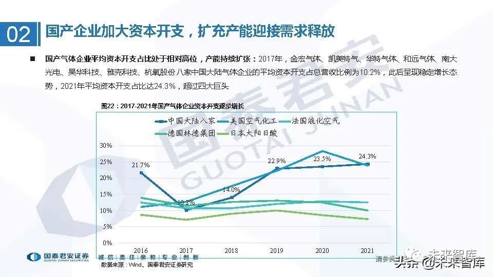 國產氣體企業平均資本開支占比處於相對(duì)高位,產能持續擴張:2017年,金宏氣體、凱(kǎi)美特氣、華特氣體、和遠氣體、南大 光電、昊華科技、雅克科技、杭氧股份八家中國大(dà)陸(lù)氣體(tǐ)企(qǐ)業的平均資本開支占總營收(shōu)比例為10.2%,此後呈現穩定增長態 勢,2021年平均資本開支占(zhàn)比達24.3%,超(chāo)過四大巨頭。(報告來源:未來智庫)