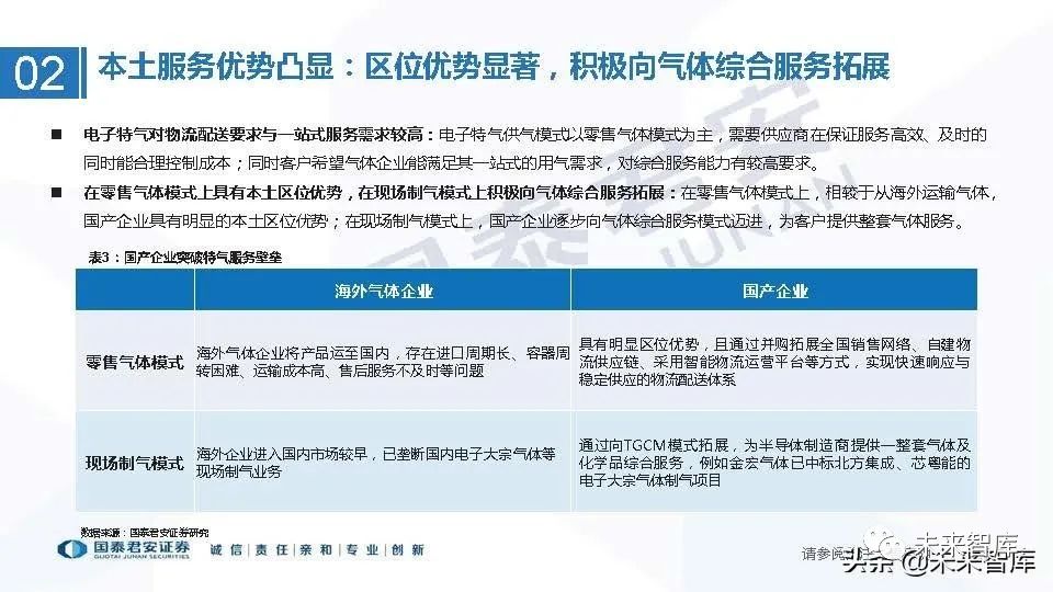 電子特氣對物(wù)流配送要求與(yǔ)一站(zhàn)式服務需求較高:電子特氣供氣模式以零售氣(qì)體(tǐ)模式為主,需要供應商在保證服務高效、及時的 同(tóng)時能合理控(kòng)製成本;同時客戶希望氣體企業能滿足其一站式的用氣(qì)需求,對(duì)綜合服務能力有(yǒu)較高要求。在零售氣體(tǐ)模式(shì)上具有本土區位優勢,在現(xiàn)場製氣模式上積極向(xiàng)氣體綜合服務拓展:在零售氣體(tǐ)模式上,相較(jiào)於從海外運(yùn)輸氣體, 國產企業具有明顯的本土區位優勢;在現場製氣模式上,國產企業逐步(bù)向氣體綜合服務模式邁進,為客戶提(tí)供整套氣體服務。