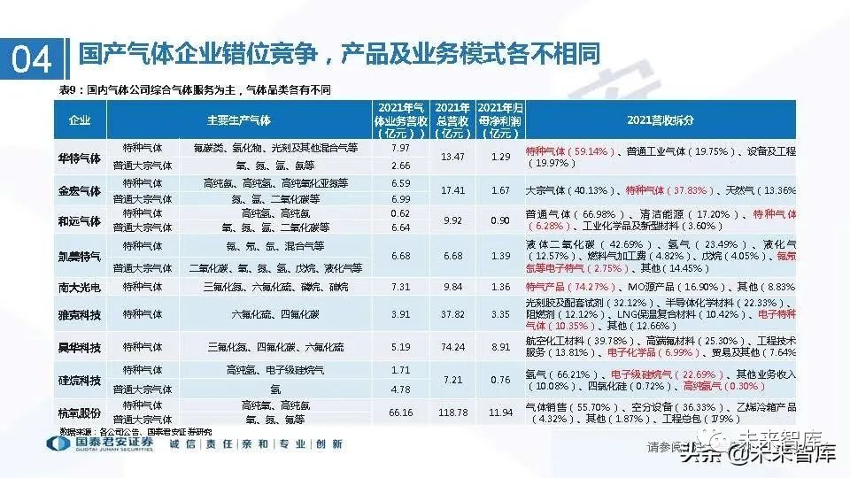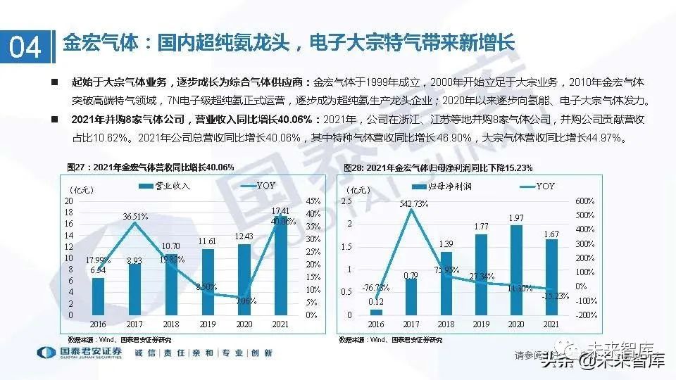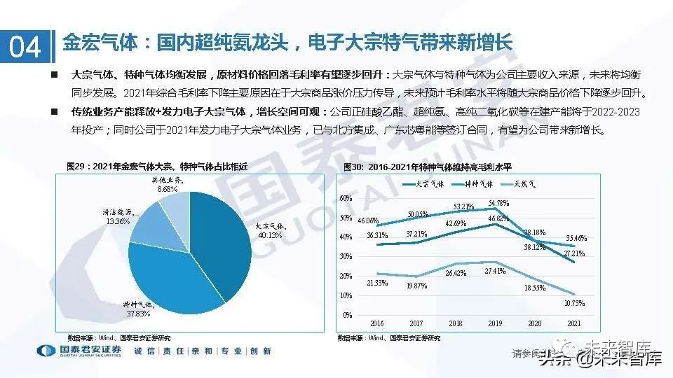 起始於(yú)大宗氣體業務,逐步成(chéng)長為綜合氣體供應商:金(jīn)宏氣(qì)體於(yú)1999年成立,2000年開始(shǐ)立(lì)足於大宗業(yè)務,2010年金宏氣體 突(tū)破高(gāo)端特氣領域,7N電子級超純氨正式運營,逐步成為超純氨生產龍頭企業;2020年以來逐步向氫能(néng)、電子大宗(zōng)氣體發力。2021年並購8家(jiā)氣體公司,營業收入同比增長40.06%:2021年,公司在浙(zhè)江、江蘇等地並購(gòu)8家氣體公司,並購公司貢獻營收(shōu) 占比10.62%。2021年公司總營收同比增長40.06%,其(qí)中特種氣體營收同比增長46.90%,大宗氣體營收同比增(zēng)長44.97%。