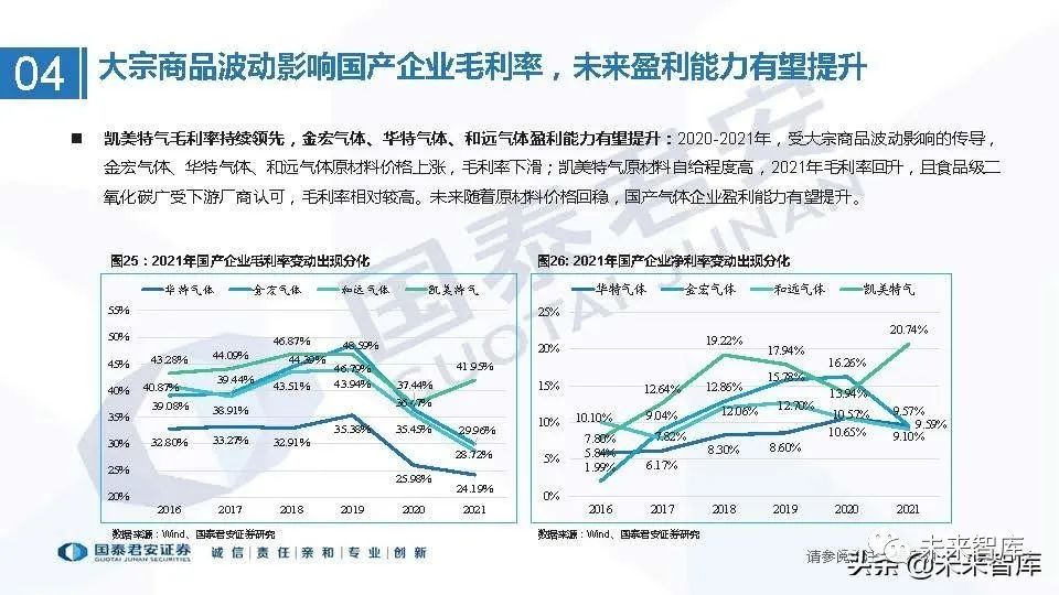 凱美特氣毛(máo)利率(lǜ)持續領(lǐng)先,金宏氣體、華(huá)特氣體、和遠氣體盈利能力有望提升:2020-2021年,受大宗商(shāng)品波動影響的傳(chuán)導, 金宏氣體、華特氣體、和遠氣體原材料價格上漲,毛利率下滑;凱美特氣原材料自給程度(dù)高,2021年毛利率回(huí)升,且(qiě)食品級二 氧化碳廣受(shòu)下遊廠商認可,毛利率相對較高。未來隨著原材料價格回穩,國產氣體企業盈(yíng)利能(néng)力有望提升。