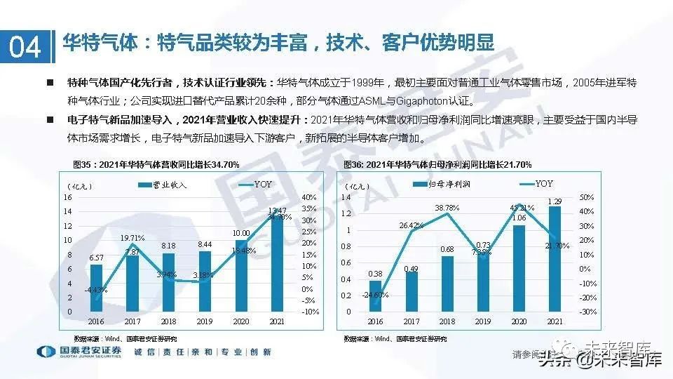 特種氣體國產化先(xiān)行(háng)者,技術(shù)認證行業領先(xiān):華特(tè)氣體成立於1999年,最初主要麵對普通工業氣體零售市場,2005年進軍(jun1)特 種(zhǒng)氣體行業;公(gōng)司實現進口替代產(chǎn)品累計20餘種,部分氣體通過ASML與Gigaphoton認證。電子(zǐ)特氣新品加速導入,2021年營業收入快速提升:2021年華特氣體營收(shōu)和歸母淨利潤同比增(zēng)速亮眼,主要受(shòu)益於國內半導 體市場需求增長,電子特氣新品加速導入下遊客戶,新拓展的(de)半導體客戶增加。