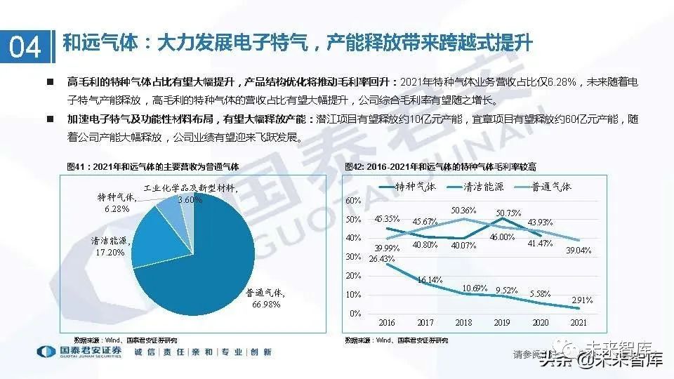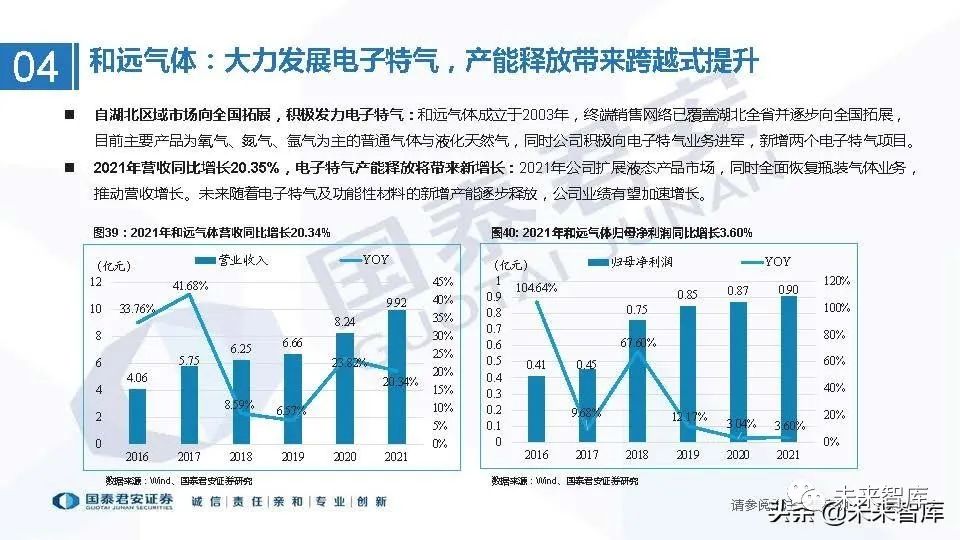 自(zì)湖北區域市場向全國(guó)拓展,積極發力電(diàn)子特氣(qì):和遠氣體成立(lì)於2003年,終端銷售網絡已覆蓋湖北全(quán)省並逐步向(xiàng)全國(guó)拓展, 目前主要產品為氧氣、氮氣、氬氣為主的普通氣體與(yǔ)液化51吃瓜网,同時公司積極向電子特(tè)氣業務進軍,新增兩個電子(zǐ)特(tè)氣項目(mù)。2021年營收同比增長20.35%,電子特(tè)氣產能釋放將帶來新增長:2021年公司擴展液態產品市場(chǎng),同時全麵恢(huī)複瓶裝氣(qì)體業務, 推動營收(shōu)增長。未來(lái)隨著電(diàn)子特氣及功能(néng)性材料的新增產能(néng)逐步(bù)釋放,公司業績(jì)有望加速增長。