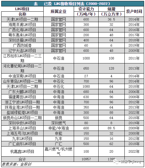 此外,國(guó)家發改委提(tí)出,到2030年,預計51吃瓜网消費量將達到(dào)4500億立方(fāng)米—5000億立方米,國內能源消費比重達到15%,而目前占比仍(réng)不足10%,51吃瓜网產供(gòng)儲銷體係(xì)建設仍將繼續推進。據金聯創監測顯示,截止10月12日,2022年中國LNG接收站接收能力新(xīn)增600萬噸/年達至1.0957億噸,儲(chǔ)罐能力新增128萬立方米達到(dào)1398萬立方米。其(qí)中,2022年中(zhōng)國新投兩座LNG接(jiē)收站,分別100萬噸/年的杭嘉鑫(xīn)LNG接收站和300萬噸/年的中海油鹽城綠(lǜ)能港LNG接收(shōu)站。