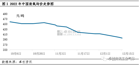 四季度以來,液氧采購減(jiǎn)少,廠商(shāng)出貨承壓,價格多有(yǒu)下調。截至12月15日,液氧市場均價396元/噸,環比上周價格降1.98%,同比降13.54%。