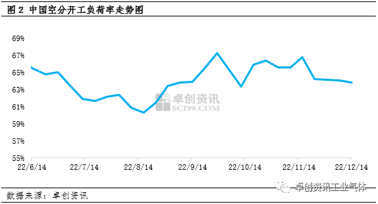 本(běn)周空分開(kāi)工負荷率63.84%,較上周開工負荷率窄幅下滑0.23個百分點。受空分開工負荷下滑影響,液氧供給有所減(jiǎn)少,但在需求更加弱勢局麵下,廠商出貨承壓,液(yè)位多有升高。