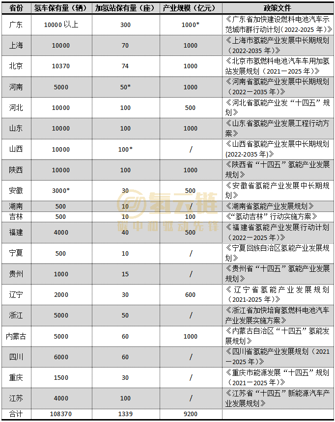 統計說明:各省份均以最新文件(jiàn)統計,帶星號的為估(gū)算值,其中加氫站以100輛氫車配1座加氫站的比例估算,廣東省產業規模(mó)則根據北京和(hé)上海的類比估算,保守估計(jì)為1000億。