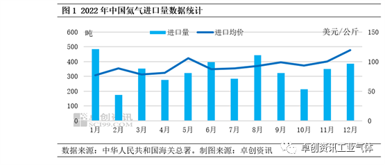 從分月數據來看,2022年1月進口均價下降3.01%至76.8美元/公斤(jīn),支撐氦氣進口量達到485.31噸,創近10年單月(yuè)進口量新高。受春節假期、卡塔爾(ěr)裝置檢修以及進口均價上漲等影響,2月進口量最少,共175.864噸,回歸到7年前的單月進口水平。3月份市場步入正軌,受進口均價下降以及需求提升的帶動,氦氣進口量增至353.884噸。4月華東地區管控較嚴,氦氣(qì)到港後(hòu)不(bú)能正常通(tōng)關,導致進口量環比減少22.19%至275.374噸。5月管(guǎn)控力度有所放鬆,且部(bù)分進口貨轉港至青島、寧波等港口,支撐進口量增(zēng)至324.357噸。進入6月,氦氣進(jìn)口量繼續增加,且前期積壓在港口的進口貨陸續通關,支撐進口量繼續提升,總(zǒng)進口量396.427噸,環比增加22.22%,同(tóng)比增(zēng)加17.26%。7月需求跟進緩慢,且進口均價上漲影響,進口量下滑至285.123噸。8月進口貨到港正常,進口量(liàng)增至442.668噸,之後因卡(kǎ)塔爾(ěr)部分裝置檢修(xiū),氦氣進口(kǒu)量下滑。11-12月雖進口量有所恢複,但進口均價上漲明顯,影響進口水平。