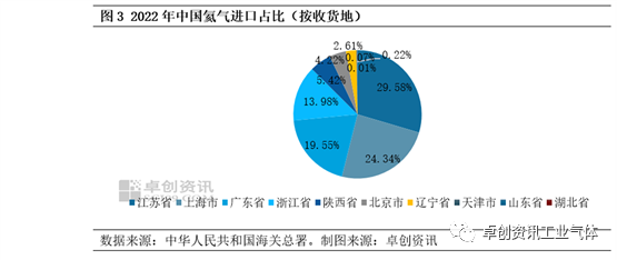 2022年中國進口氦氣(qì)地區主要為江蘇省,其(qí)占比29.58%,依托經濟強省及地理位置,進口量排名第一,進口企業主要為空氣化工、林德、梅塞爾、液空(kōng)等企業;其次(cì)是上海,進口占比達到24.34%;廣東進口量排名第三,占比19.55%。另(lìng)外,浙(zhè)江、陝西、北京、遼寧、天津、山東、湖北均有進口氦氣。
