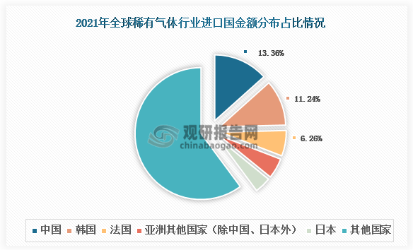 由於我國稀有氣體行業嚴重依(yī)賴進口(kǒu),且進口量遠高於出口量,所以行業進口(kǒu)金額也要遠大於出口金額(é)。據中國海關數據,2021年我國稀有氣體進口金額達到3.178億美元(yuán);而出口金額隻有約為(wéi)0.68億美元。全球範(fàn)圍來(lái)看,在2021年我國更是(shì)成為稀有氣體進口金額(é)最大國。根(gēn)據聯合國貿易數據庫顯示,2021年全球稀有氣體進口金(jīn)額為23.79億美元,其中中國稀(xī)有氣體進口金(jīn)額(é)占比13.36%,成為全球稀有氣體(tǐ)進口金(jīn)額最大國;其次是韓國和(hé)法國,進口金額占(zhàn)比分別為11.24%和6.26%。