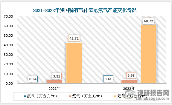 市場價格接連創高,在高利潤促使以及國內半導(dǎo)體行業(yè)持續發力(lì),稀有氣體需求增長推動下,國內稀有氣體(tǐ)行業產能也快速擴張。2022年中國(guó)氙氣產能增長至0.41萬立方米,氪氣產能增長至3.98萬立方米,氖氣產能增(zēng)長至60.72萬立(lì)方米;較2021年分別增長20.59%、20.24%、42.13%。