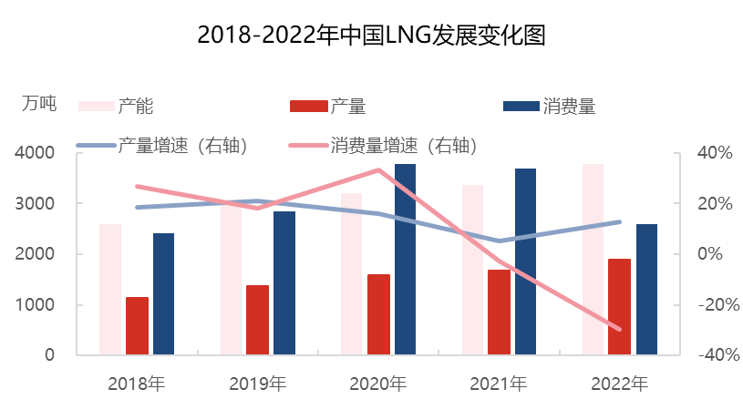 由2018-2022年國內LNG變化圖中可以看出,2018-2019年國內LNG產能大於消費量,另(lìng)外國家(jiā)倡導“宜氣則氣(qì)、宜煤則煤”,“煤改(gǎi)氣”政策導向(xiàng)寬鬆,LNG整體發展速度明顯(xiǎn)放緩(huǎn)。2020年受(shòu)疫情影響,國際LNG低價資源大量進(jìn)入國內市場,提高了國內終端使用LNG積極性,國產LNG消費量大幅增(zēng)加。2021年在國際大宗商(shāng)品大麵積“通脹”以及國際LNG供應偏緊的局勢下,國際LNG現貨價格出(chū)現大幅上漲,導致(zhì)國內用氣成本升高,LNG終端多轉向使用(yòng)管道氣,LNG消(xiāo)費量在近十年來首次(cì)出現下滑(huá)。2022年俄烏衝突使國際局勢更加緊張,進口LNG資源明顯減少,國(guó)內 LNG價格高企,下遊LNG消費量明顯減少。