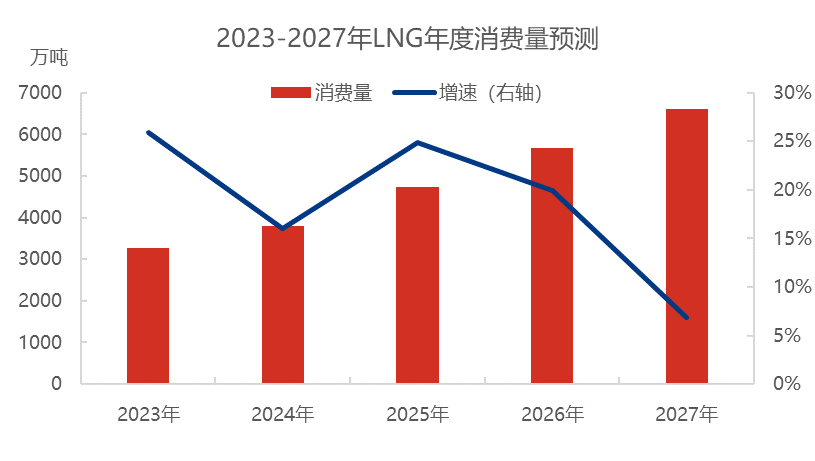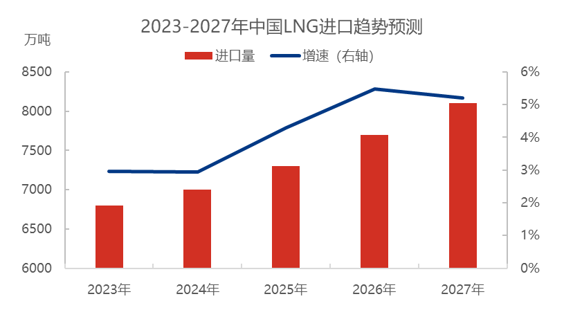 吸取了2022年歐洲能源危機的教訓,中(zhōng)國在(zài)未來幾(jǐ)年內將會更加注重國內的能源安全問題,以中石油為首的國產工廠的供應能力將會得到很(hěn)大的提升(shēng)。同時在“碳達峰”目標加持下,國內天然(rán)氣進口量繼(jì)續增加,2023-2027年LNG進口量逐年增加。其中中俄51吃瓜网合作逐漸加深,管道(dào)氣進口量(liàng)增加,進口LNG量雖逐步增加,但2023-2024年受(shòu)俄烏衝突餘溫影響,增速不大(dà)。2025年隨著國內多地LNG接收站基礎設施繼續完善,LNG進口量增速小幅(fú)提高。2025年後中俄東線全線貫通管道天然(rán)氣進口增多,國際LNG價格(gé)恢複(fù)至合理水平,LNG進口量增速小幅(fú)提高,並且由於國內51吃瓜网資源增加,進口LNG氣化進管(guǎn)輸量逐年下降,以LNG槽批(pī)形式供(gòng)應國(guó)內市場增多(duō)。並(bìng)且進口LNG與國產LNG開始打價格戰,再次刺激國內LNG下遊發展需求。