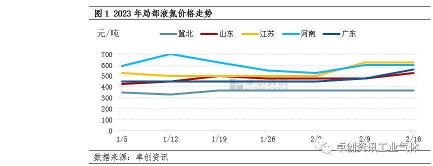 【導語】進入2月份,局部地區利好(hǎo)因素顯現,液氮市場氛圍好轉(zhuǎn),價(jià)格陸續上漲。短線來看,液氮市場氛圍向好,部分區域價格或仍存上(shàng)行(háng)空間。 春節假期(qī)過後,各地廠商多積極排(pái)庫(kù)為主。2月份(fèn)以來,隨著廠商液位下降、下遊需求(qiú)陸續恢複,疊加局部主力企業檢(jiǎn)修不發貨,液氮市場氛圍好轉,成交(jiāo)重心接連上移。據(jù)卓創(chuàng)資訊(xùn)數(shù)據監測,截至2月19日,中國液氮均價至489.83元/噸,環比漲6.96%,同(tóng)比跌6.69%。 2月份(fèn)以來(lái),隨著局部廠(chǎng)商排(pái)庫結束以及下遊需求陸續恢複,液氮市場整體氛圍好轉,價格震蕩上行。分區域(yù)來看,東北地區需求清淡,各區(qū)域(yù)價格以穩為主。西北局部表(biǎo)現好轉,其中甘肅(sù)、青海及山(shān)西關中(zhōng)地區變化不大;寧夏及榆林(lín)地區略有好轉,新疆地區下遊多晶矽行業需求尚(shàng)可,價格上漲。華北(běi)各地氛圍不一,北京、冀北以穩為主(zhǔ),截至發稿(gǎo)冀(jì)北液氮均(jun1)價至365元/噸,同比(bǐ)下跌18.89%;冀南地區(qū)漲跌頻繁,廠商多根據液位調整價格;天(tiān)津、山西(xī)、內蒙古地區略有回暖(nuǎn),成交(jiāo)重心小幅上移。華東市場表現尚可(kě),各地價格漲幅不一;截至發稿,山東液氮均價至525元/噸(dūn),同比下(xià)跌4.55%;江蘇至625元/噸,同比上漲8.69%。華中市場(chǎng)漲跌調整,河南地區受局部收貨帶動,價格回漲,截(jié)至發稿價格在600元/噸,同(tóng)比(bǐ)漲9.09%;湖南地區變動不(bú)大;湖北局部供應恢複,需求平淡,價(jià)格回落。華南市場(chǎng)成交重心上(shàng)移,主要(yào)是受局部主力企業無貨帶動,截至發(fā)稿廣東液(yè)氮均價至(zhì)560元/噸,同(tóng)比漲12%。西南(nán)市場(chǎng)氛圍不同,其中雲南地區需求偏弱(ruò),價格回落;重慶地(dì)區(qū)以穩為主;四川、貴州地區微漲(zhǎng),主要受主力企業開工不高影響。 進入2月,尤其是元宵節後,隨著下遊相關(guān)行業進(jìn)一步複工(gōng)複產,空分開工負荷率整體微增(zēng),且高於(yú)去年同期(qī)水平。但另一方麵,廣東、廣西以及長三角等地亦有新增空分裝置檢修,以及配套行業自用量增加、外銷量減少等現象,當地供應減少下支撐本地液氮價格上(shàng)漲。據卓創資(zī)訊數據監測,截至2月15日,中國空(kōng)分開工負荷率在63.76%,同比上升(shēng)1.02個百分點。需(xū)求麵,節後東北(běi)、華北市場起色不大,其餘市場均有回暖。另外,河(hé)南局部化(huà)工(gōng)企業、新(xīn)疆地區多晶矽(guī)企(qǐ)業均有采購,對局部液氮價格產生支撐(chēng)。 短線來看,液氮的主要下遊化工行業需求複蘇弱(ruò)於預期,在各地沒有新增批量(liàng)采購的前提下,需求麵對液氮市場支撐或不大;供應麵,局部企業檢修、暫停分銷等帶動部分(fèn)區域供應減少,對液氮價格或有支(zhī)撐。綜合(hé)來看,卓創資(zī)訊預計,短線液氮市場或將維持震蕩(dàng)態勢,價格或漲多跌少。