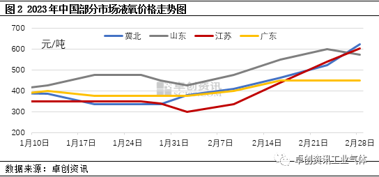 年後(hòu)液氧價格處於年內較低(dī)水平,隨著需求回暖,市場看漲情緒濃鬱。自元宵節以後(hòu),液氧市場表現良好,各地在利好因素影響下,各(gè)地(dì)價格加速上漲。