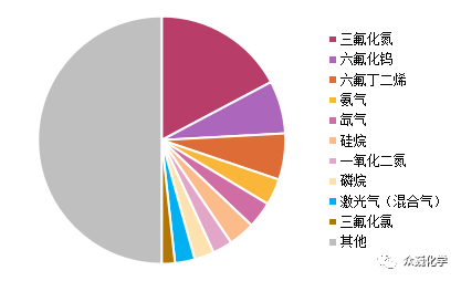 此外,不同電子特種氣(qì)體的使(shǐ)用(yòng)量、價格差別較大,因此市場規模也相差較大,其(qí)中全球市(shì)場規模排名靠前(qián)的電子特種(zhǒng)氣體為三氟化氮、六氟化鎢、六氟丁二烯、氨氣等,前十大氣體占比58%。