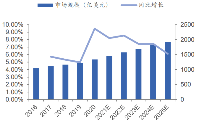 根據中國半導體協會, 2020年中國集成電路(lù)行業銷售額為8848億元,同比增長17%,近五年年複(fù)合增長率GAGR達20%。半導體屬電動汽車、數碼3C、光伏等成長型行業的核心器件,下遊(yóu)需求持續增長。同時,半導體又是我(wǒ)國(guó)被“卡脖(bó)子”的戰略新興產業,近兩年國內(nèi)產能大幅擴張,預(yù)計未來行業(yè)仍有望保持(chí)較快增長。