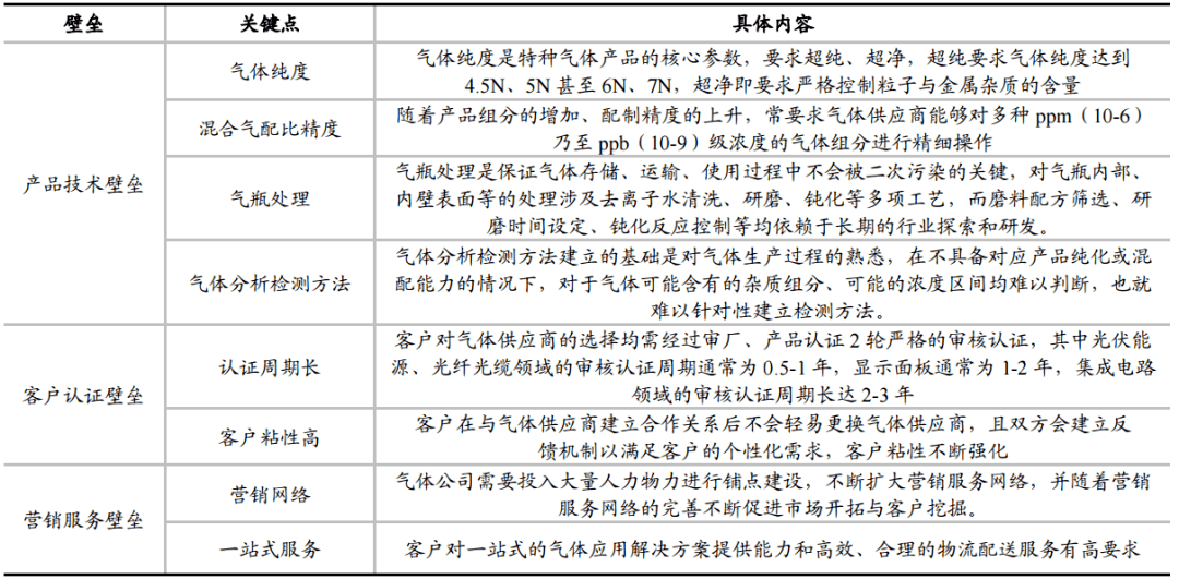 特種氣體行業(yè)壁壘高,主要體現在(zài)產品技術壁壘、客戶認證壁壘(lěi)、營銷服務壁壘上。