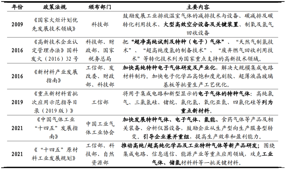 內資企業分頭突圍,電子特氣國產化率有望進一步提(tí)升。國內氣體公司在資金、技術(shù)、設備等方麵較國外企業仍有(yǒu)差距(jù),但在(zài)技術(shù)不斷突破、國家政策大力扶(fú)持、下遊市場發展迅速等多(duō)重因素影響下,國內氣體企業的(de)競爭力不斷增(zēng)強,市場份(fèn)額有望擴大。進(jìn)入十四五以來,各地密集出台政策,重點支持特種氣體,尤其是應用(yòng)於集成電路及新型顯示的電子氣體的研發及產業化。其中,江蘇省、浙江省和廣東省的十四五規(guī)劃中均提到“加快電(diàn)子氣體研(yán)發與產業化應用”。在(zài)政策的積極支持以及半導體產業的國產化需求(qiú)下,特種氣(qì)體將迎來新的發展機遇。