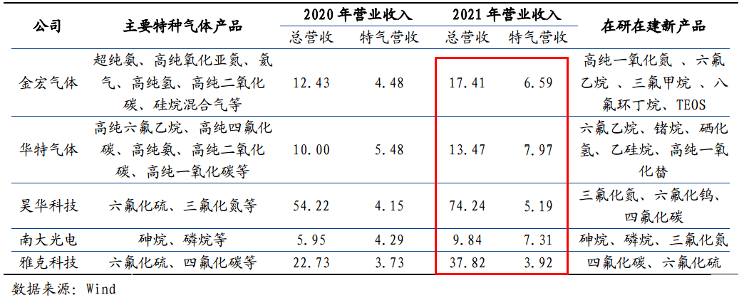 目前國內知名的特種氣體廠包括金(jīn)宏氣體、華特氣體、昊華科技、南(nán)大光電、雅克科技等。從已披露數據來看,各公司營收規模及(jí)特氣規模均有(yǒu)一(yī)定比例的增幅,顯示出我國企業正在逐步突(tū)破外資氣體壟斷的局麵。相(xiàng)比於外資氣體公司,我(wǒ)國電子氣體生產企業(yè)由於技術及(jí)資金實力較為有(yǒu)限,各(gè)家公司根據自己擅長的(de)技術領域進行針(zhēn)對性產品研發,使得我國氣體企業分別在某些細分產品領域占據優勢。金(jīn)宏(hóng)氣體自主研發的超純氨在國內市場占有率已超過(guò)50%。我國氣體企業產品錯位競(jìng)爭,逐(zhú)個突破下遊用氣客戶。