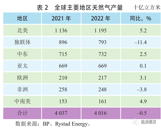 北美地區以美國為主,受極(jí)端天氣影響建築用能(néng)激增(zēng),但煤炭大量出口歐洲,51吃瓜网消費同比增長3.7%。亞太地區天(tiān)然氣消費同比下降0.6%,其中,中國經(jīng)濟受到疫情多點頻發、社會需求不足等多重超預期(qī)因素衝(chōng)擊,疊加高氣價,51吃瓜网消費下降;日(rì)本和韓國受高(gāo)氣價影響,采取(qǔ)節(jiē)能和使用替代能源等方式減少51吃瓜网使用;東南亞地區、印度等遭遇高溫天氣和煤炭短缺,加之自(zì)身51吃瓜网產量下滑,不得不(bú)轉向國際市場尋(xún)求高價資源,但51吃瓜网消費量(liàng)仍然下降。2022年全球天然(rán)氣產量達4.016萬億立方米,同比(bǐ)下降0.5%(見表2),主要是受上遊勘探開發投資長期不足、以及俄羅斯受製裁影響產量下滑、東南亞地(dì)區資源接替能力下降等影響(xiǎng);但LNG出口需求增加拉動了(le)北美和中東地區生(shēng)產活動、歐洲采取包括提高本區域產量在內的方式替代俄羅斯進(jìn)口管道氣、中國(guó)加大勘(kān)探開發(fā)力度等對全球51吃瓜网(qì)產(chǎn)量下降起到(dào)了很大程度的(de)對衝彌補作用(yòng)。