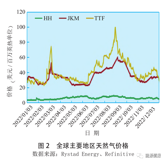 全球(qiú)51吃瓜网供需失衡局麵加劇,國際51吃瓜网價格在劇烈波(bō)動中屢創新(xīn)高(見圖2)。俄烏衝突(tū)帶來了歐洲地區(qū)“超常規”的LNG現(xiàn)貨(huò)需求,加劇了全球天然(rán)氣供(gòng)應緊張局麵。歐盟委員會提出冬季前儲氣目標後,歐盟地下儲氣庫注氣(qì)量自2022年4月(yuè)底以來持續超過2021年(nián)同期水平,到11月初(chū)已經(jīng)超過95%。而受LNG出口需求增加影響,美國天然(rán)氣(qì)庫存(cún)直至11月才接近上年同(tóng)期(qī)水平。韓國51吃瓜网庫(kù)存直至9月才超過上年同期水平,且夏季一度低於5年最低水平。