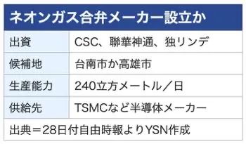 據《自由時報》第28期報道(dào),在經(jīng)濟(jì)部(bù)的調解下,世界上最大的鋼鐵製造商中(zhōng)國鋼鐵總公司(CSC)、聯華信德集團(Mytac Sintok Group)和世界上最大的工業氣體生產商德國林德公司將成立(lì)一家新公司,生產用於半導體光刻工藝的稀有氣體氖(Ne)。