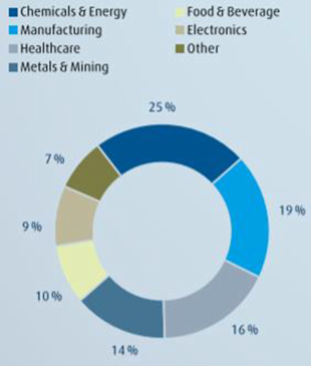 4)全球市場(chǎng):下遊集中在能源、製造、醫療、食品、電子等領域