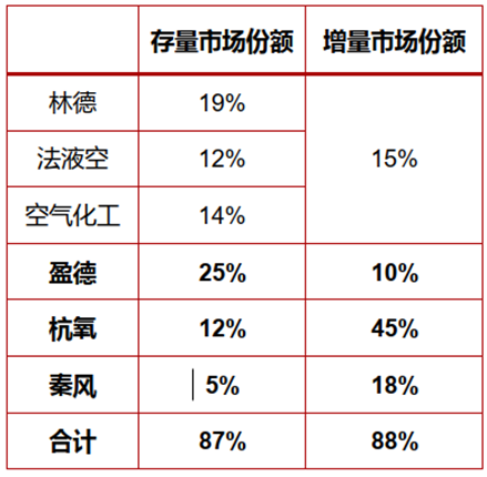 外(wài)包供氣比例提升:第三方供(gòng)氣模式符合行業未來的發展趨勢,海外外(wài)包占比80%,國內40%