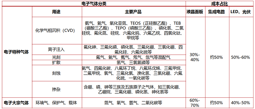 電子特氣品種繁多、單一產(chǎn)品用量較小,占下遊氣體總成本的比例50%左右