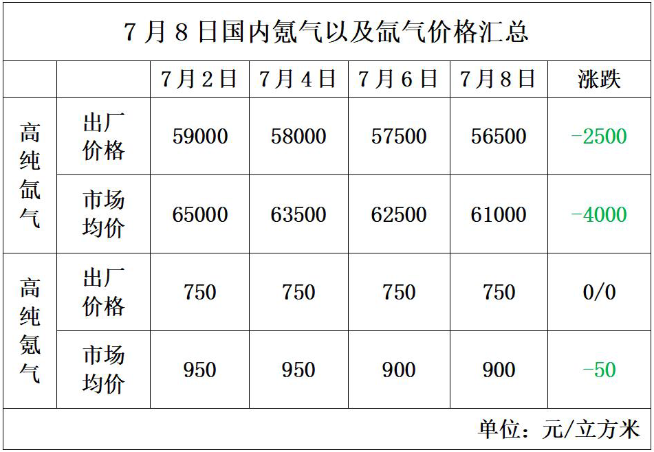 自7月份以來,國內氪氙市(shì)場持續疲軟,上遊主力氪氙(xiān)精提廠(chǎng)家裝置運行(háng)一般,相(xiàng)比(bǐ)前期,裝置(zhì)開工率明顯下滑,部分高純氪氣以及高純氙氣產量多有減少(shǎo);然(rán)而(ér)上遊(yóu)供貨市(shì)場並未出現明顯缺貨狀況,各大主力廠(chǎng)家前期積累的庫存充裕,短期內庫存出貨仍為主流走貨態勢,本周高純氪氣以及高純氙氣價格變(biàn)化如下: