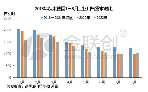 據德國聯邦網絡管理局統計,2023年(nián)德國工業用氣需求同比下滑2%-19%,雖8月出現正增長,但主要原因(yīn)是(shì)受(shòu)去年同(tóng)期基數偏低影響較大;較2018—2021年同期均值增速大幅下滑,範圍在16%-23%。據專家(jiā)對(duì)德國2023年經濟前景的預測,德國工業用氣需(xū)求仍難有起色。