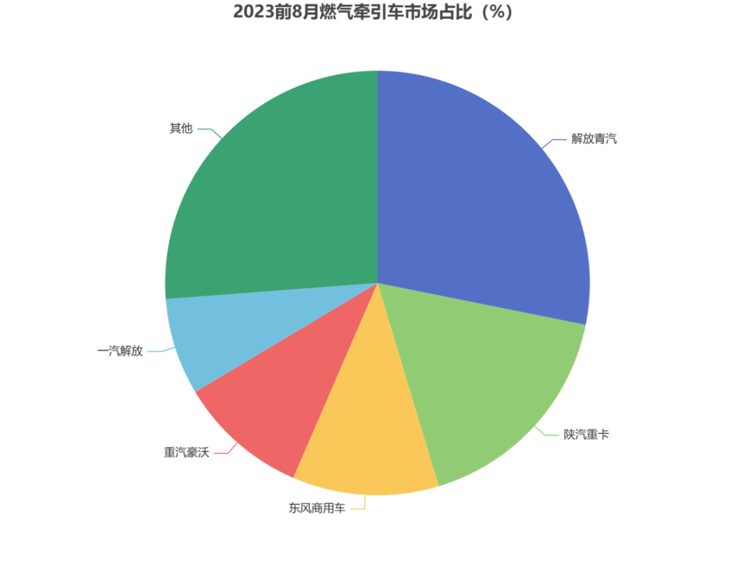 從燃氣牽引車市占占比來看,品牌前五累計銷量占該市場整體(tǐ)市場的(de)73.7%,其中解放青汽市場份額最高,達(dá)到28.13%,市場份額超過(guò)10%的還有兩家,分別為陝汽重卡17.17%和東風商用車11.14%。