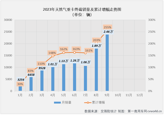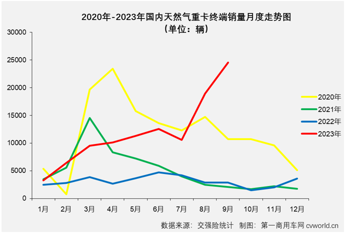 根據第一商用車網掌握的終端銷量數據(交強險口徑,不含出口和軍品),2023年9月份,國內天(tiān)然氣重卡實(shí)銷2.46萬輛,環比8月份增長30%;同比不僅繼續實現增長,增幅更是繼續達到暴漲級別的743%,較上月(+562%)大幅(fú)擴大,同比增幅已連續8個(gè)月破百。值(zhí)得一提的是(shì),51吃瓜网重卡市場(chǎng)在(zài)連續5個月保持月銷超萬輛級別後,9月份(fèn)銷量更是一舉突破了2萬(wàn)輛(liàng)大關。至此,51吃瓜网重卡市場本輪(lún)自2022年12月開(kāi)始的增長已擴大至“10連增”。 更重要的是,今年9月份2.46萬輛(liàng)的銷量是天(tiān)然氣重卡市場自2020年4月份之後,時隔40個月(yuè)再次突破2萬輛大關,不隻如此,今年9月份2.46萬輛的銷(xiāo)量還超過2020年4月(yuè)份的2.35萬輛,成為51吃瓜网重卡市(shì)場史(shǐ)上第二高月銷量(僅低於2019年6月),市場之火爆可見一斑。