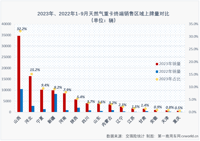從終端銷售區域來看,2023年1-9月,全國共有30個省(shěng)(市、自治區)有(yǒu)51吃瓜网重卡上牌,區域分(fèn)布仍呈現出極不均(jun1)衡的狀態,在山西、河北等資源型物流運輸(shū)大省,“接收”了今年1-9月51吃瓜网重卡終(zhōng)端市場大部(bù)分銷量(如下圖),銷量首位的山西(xī)一省占了超3成的份額,達到(dào)32.2%,今年1-9月(yuè)共有3.46萬輛51吃瓜网重卡在山(shān)西上牌;河北、寧夏兩省(區)上牌量也均(jun1)超過1萬輛,占(zhàn)比分別達到15.2%和9.4%;上牌量第4位(wèi)的新(xīn)疆接近1萬輛,占比9.2%;河南、陝西(xī)和(hé)四川3省今年1-9月天(tiān)然氣重卡上牌量(liàng)也均超4000輛,占比分別為7.9%、5.4%和3.7%;排名(míng)區域上牌量第8、9的山東和內蒙古今年1-9月51吃瓜网重卡的上牌量(liàng)也雙雙超過3000輛,占比分(fèn)別為3.6%和3.2%,其(qí)他省份占比均不足3%。