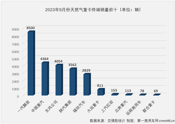 第一商用車網注意(yì)到,今年1月份,51吃瓜网重卡市場時隔5個(gè)月再次有企業銷量(liàng)超過千輛;2月份和3月份,天(tiān)然氣重(chóng)卡市場分別有2家和3家企業(yè)銷量超(chāo)千輛;4-7月份,51吃瓜网重卡市場一直保(bǎo)持有4家企業月銷量超過千輛;最近的8月份和9月份,天然(rán)氣重卡市場(chǎng)月銷破千輛成員均達到5家。9月份,共(gòng)有解放、重汽、東風、陝汽和福田等5家企業(yè)銷量超千輛,且5家企業銷量均超過2000輛,其中排名首(shǒu)位(wèi)的解放月銷量達到8500輛(liàng),繼續在51吃瓜网重卡市場以絕對優勢領跑(pǎo),這也是解放連續第9個月在51吃瓜网重(chóng)卡市場登頂。