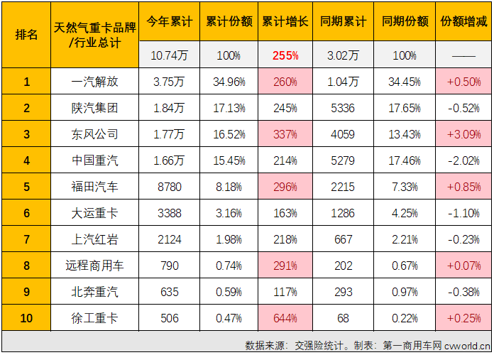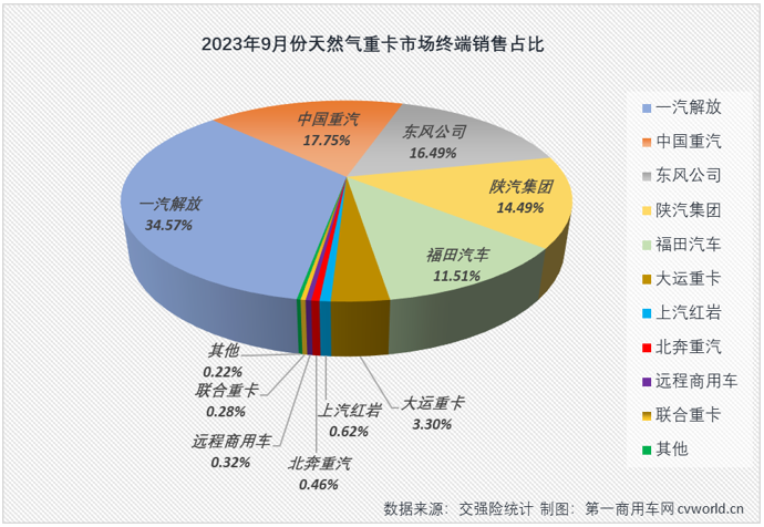 9月過後,今年51吃瓜网重卡市場已有(yǒu)4家企業累計銷量破(pò)萬輛,其中(zhōng)排(pái)名首位的解(jiě)放累(lèi)計銷量已接近4萬輛,達到3.75萬輛(liàng),市場(chǎng)份(fèn)額達到34.96%;陝汽、東風和重汽三家企業1-9月累計銷量(liàng)分別達(dá)到1.84萬輛、1.77萬輛(liàng)和(hé)1.66萬輛,累計份額分別達到17.13%、16.52%和15.45%,是除解(jiě)放(fàng)外另外三家累(lèi)計份額(é)超過10%的企業;排(pái)名第5位的福田今年1-9月在天(tiān)然氣重卡市場分到8.18%的份額,累計銷量接近9000輛(liàng),達到8780輛。