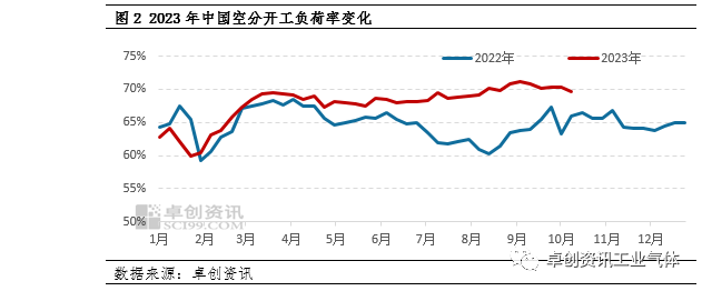 7月份以來,空分開工負荷率維持高位運行,整體在(zài)70%附近波動,遠高於去年同期水平。據卓(zhuó)創資訊數據監測,三季度中國空分開工負荷率平均為69.75%,較去(qù)年同期提升6.8個百分(fèn)點,液氬(yà)產量也維持中高水平(píng),三季度(dù)全國液氬總產量在123.6萬噸,較去年同期增長19.55%,對市場支撐力度減弱。假期結束後,華北、華東、華南等地局部地區企業檢修,疊加河北地區高爐開工下(xià)滑,中國空分開工負荷(hé)率降(jiàng)至69.69%,支撐市場向好(hǎo)發展。