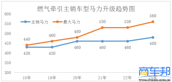 我們先來回顧一下近年來燃氣牽引車產品發展曆程。2018年行業主銷燃氣重卡為濰柴430馬力車(chē)型(xíng),最大馬力是(shì)玉柴440馬力車型,難以衝擊普遍需求在460馬力以上的散配運輸行業。2020年燃氣重卡(kǎ)主銷產品升級至460馬力,但480馬力產品仍未成熟,處於導入試用階段。隨著今(jīn)年氣價下降、燃氣重卡強勢(shì)回歸,主銷產品(pǐn)已全麵升級(jí)至480馬力以上。